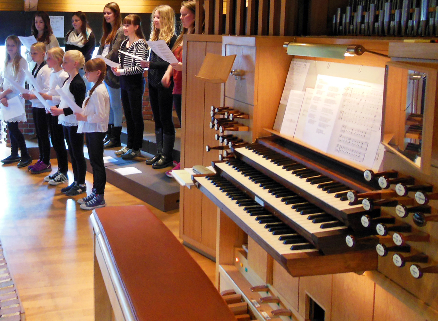 værksted". På nodebrættet står akkompagnementet til dagens altergangsmusik. Man kan også se, hvilke klange orglet er indstilllet til (dog ikke, hvilke klaviaturer, der har været i brug. |